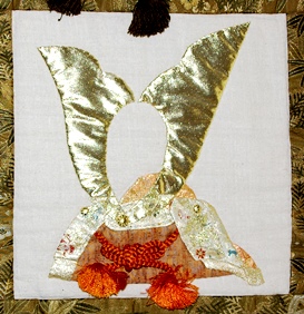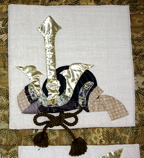 イギリスのリーズに王立武具博物館がオープンした時に、博物館でキルト展が開かれました。その時に招待展示のお話をいただいて、制作したキルトです。武具にちなんで、さまざまな形の兜をアップリケしました。レースやラメの布、羽織の紐など、兜にぴったりの材料を苦労して探したのも楽しい思い出です。オーストラリアでも展示されました
